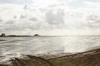 A picturesque coastal landscape in Germany during the early morning hours. The white sand beach stretches out towards the open space of the Wadden Sea. A man walks along the shore, his kite flying above the wet surface of the sea.