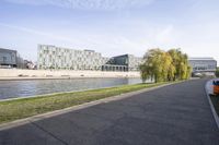 An autumn day in Berlin, Germany. The cityscape showcases the modern architecture and urban design. Coastal road along the river leads to the harbor with a jetty and a pier. Clear sky and ocean create a serene atmosphere in this bustling European city.