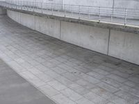 A modern architecture bridge in Berlin, Germany. The concrete surface and handrail create a sleek and urban design. Open space and clear sky surround the bridge, making it a stunning piece of European architecture.