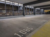 A view of a parking garage in Berlin, Germany. The urban architecture of the building blends with the surrounding cityscape. The concrete floor and metal structures create interesting shadows on the open parking level.