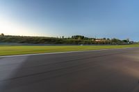 Motion blur on Nürburgring's Nordschleife race track in Germany during dawn. Clear sky creates a serene backdrop for racing enthusiasts. Asphalt road signifies the start of an exhilarating race.