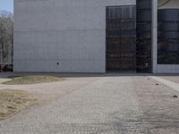A modern office building in Berlin, Germany. The concrete and glass architecture blends seamlessly with the urban landscape. Clear sky casts shadows on the grassy areas and roads. A perfect representation of modern European architecture.