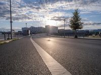 This is an image of a modern cityscape at dawn in Berlin, Germany. The photo showcases the city's impressive architecture, including office buildings and modern urban design. The asphalt road and road surface lead the viewer's eye through the image, lined by trees and fences. The clear sky and visible sun provide sunshine to the financial district, symbolizing a vibrant and bustling city life. This photo captures the essence of Berlin's business district and its European charm.