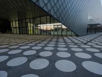 A stunning view of the Futurium convention center in Berlin, Germany. The modern architecture features a unique patterned glass facade, creating beautiful reflections and shadows. The open space inside is filled with circular designs and sleek flooring.