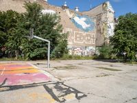 A basketball court in Berlin, Germany, located in an urban courtyard. The rugged concrete surface is adorned with vibrant graffiti, creating an artistic urban design. Open space under a clear sky, perfect for a day of sport in Europe's art district.