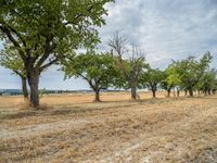 a dirt road is running between some trees in the grass in a field near the water