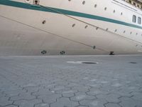 This is an image of a grey concrete and asphalt surface in Bremerhaven, Germany. The composition shows a tree-lined road with vehicles and a courtyard in the background. The light reflects off the metal pier and harbor, creating a picturesque scene of naval architecture. In the distance, a cruise ship is docked at the jetty, ready for passengers to embark. The photo represents the urban landscape and industrial atmosphere of Bremerhaven, a city in Europe. It captures the contrast between the solid flooring and the dynamic elements of the harbor.