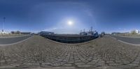 a fish eye view with a large ship in the background and a smaller boat to the right