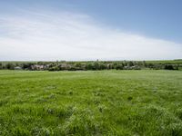 This is a picturesque image of a lush green landscape in a rural village in Germany. The vast open space is filled with fields of grass and agricultural land. The clear sky above adds to the beauty of the scene, creating a peaceful and serene atmosphere. This photo captures the essence of rural life in Europe, showcasing the natural beauty and open landscapes. It is the perfect representation of a sunny day in the countryside.