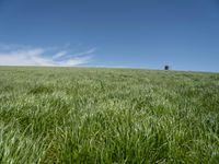 This is an image of a lush green landscape in rural Germany. The open space offers a clear view of the grassy plains with scattered trees providing shade. The cloud-dotted horizon adds depth to the scene, while the vegetation showcases the natural beauty of the European countryside. Incidental people can be seen enjoying the peaceful atmosphere. This photo captures the tranquility of the rural landscape and the harmony between nature and agriculture.