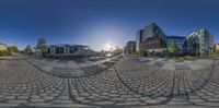 A fish-eye view of three large buildings in Berlin's business district. Cobblestone courtyard with a mix of modern architecture and historic cobblestones. The clear sky adds to the city life ambiance.