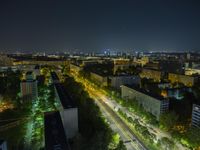 A stunning night panorama of Berlin, Germany. The city's unique architecture and high-rise buildings create a captivating cityscape. The illuminated streets and streetlights add a touch of light to the dark sky. Discover the beauty of this European metropolis.