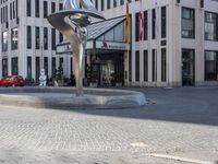 This image captures the modern architecture of Berlin, Germany. The city's metropolitan area is reflected in the mix of buildings, public spaces, and urban design. The prominent features include a concrete road, facades of mixed-use buildings, and hard shadows created by street lights. The clear sky above highlights the sleek profile of the architecture. Amidst the urban landscape, there are trees and cobblestone surfaces. The Marriott Hotel stands out with its unique sculpture and inviting hotel and restaurant offerings. This photo represents the vibrant and diverse atmosphere of downtown Berlin.