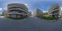 a spherical fish eye photograph of an apartment complex and parking lot, taken from a video camera