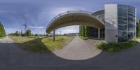 A modern bridge and building in Germany, with a backdrop of trees. The clear sky casts a hard shadow on the cityscape. This urban design combines modern architecture with natural vegetation.