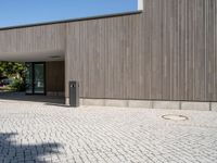 This is an image of a modern architecture building in Germany. The empty walkway in front of the building showcases the urban design and clean lines of the facade. The small light post and two poles standing out against the wall add an interesting visual element. The photo captures a typical day in the city, with people walking on the sidewalk and cars parked in the parking lot. The image represents the urban feel and modern architecture of Germany's cities.