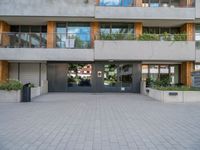 a large courtyard with a fire hydrant near some buildings and windows that look like glass