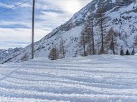 This image captures the beauty of a snowy road in the mountains of Germany. The landscape features an open space surrounded by mountain ranges, with a cliff in the distance. The snow-covered road leads towards the off-road track, with skis placed on the ground, ready for adventure. The clear blue sky and white clouds provide a stunning backdrop for this winter scene. The image represents the serene and freezing conditions of the Alpine region in Europe. It is a perfect representation of nature and the outdoors in Germany.