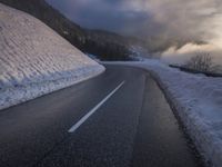 A dramatic landscape in the European highlands of Switzerland. Snow-covered mountains create a stunning backdrop to a wet road, with the sun visible through the fog. Armco barriers add to the emotional atmosphere.