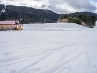 A picturesque winter landscape in rural Germany. The snow-covered mountains provide a stunning backdrop against the clear sky. The open space and ski tracks invite nature lovers to enjoy a day of winter sports in Europe.