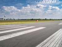 This is an image of an open space in Berlin, Germany. The landscape features a grassy field surrounded by asphalt roads. The clear sky above is scattered with cumulus clouds, allowing the sunlight to illuminate the area. In the distance, there is a lake with land lots and recreational areas. The image captures the beauty of nature in this European city. It could be a park or a recreational area, possibly even an airport or airfield like Tempelhof. The road surface and thoroughfare suggest the presence of infrastructure.
