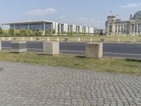 Modern architecture in Berlin, Germany. The iconic Reichstag Building stands tall against a clear sky. Urban design blends with green vegetation and tree-lined roads. A vibrant cityscape with a mix of history and beauty.