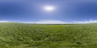 A picturesque rural landscape in Germany, featuring an empty field illuminated by the sun. The clear blue sky and lush vegetation create a serene atmosphere. Modern architecture and wind turbines are visible in the distance.