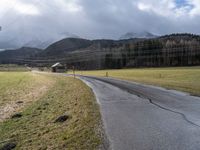 A picturesque rural landscape in Germany. An empty road leads towards an idyllic village and majestic mountains. The sun is visible, creating a sunny and vibrant atmosphere. The surrounding farm land and cropland showcase the beauty of European agriculture.