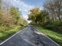 This is an image of a straight road in the rural landscape of Berlin, Germany. The road is made of asphalt and lined with lush green grass and vegetation. It is a sunny autumn day, with sunlight filtering through the clouds in the clear sky. Trees and branches can be seen along the road, adding to the natural beauty of the scene. The road surface, made of tar, represents the well-maintained infrastructure of the area. This photo showcases the picturesque countryside of Berlin and portrays the peacefulness and tranquility of rural Europe.