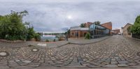 A classic architecture scene in Berlin, Germany. Cobblestone road lined with parked bikes and buildings. The urban design showcases the city's residential area. Open space and coastal views add to the charm.