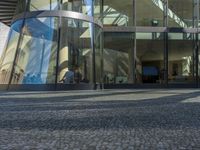 Modern architecture in Berlin, showcasing a glass wall casting hard shadows on cobblestone streets. Urban design at its finest, blending open spaces with city life. A glimpse of European urbanity in Germany.
