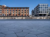 A modern architecture warehouse in Germany, in an urban area. Clear skies cast hard shadows on the surface. The storehouse is a reflection of the urban design of this European city.