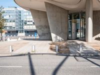 this empty sidewalk outside of a large building near streetlights and streetlights and a tree