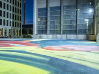 A view of Berlin city at night showcasing its modern architecture and vibrant city life. The streets and courtyards lined with graffiti walls create an urban art district. The artificial light illuminates the dark alleys, revealing the unique charm of Berlin's urban design.