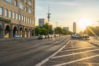 This is a photo of modern architecture in Berlin, Germany. The cityscape features sleek buildings with unique designs and clean lines. The sun shines down, casting a bright light on the urban landscape. The clear sky allows the sun to be clearly visible, adding to the vibrancy of the scene. The asphalt road below adds a touch of realism to the image, giving a sense of movement and activity. This photo captures a sunny day in Berlin, showcasing the city's modern architecture and European charm.