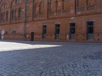 a man riding a skateboard down a cobbled in street next to tall building