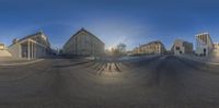 A modern architectural masterpiece in the heart of Berlin's business district. The building's classic and contemporary elements create a striking profile against the clear sky. Streets lined with shadowed office buildings lead to the city's famous museums.