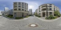 A straight road in Berlin's business district, surrounded by modern architecture. Cobblestone pavement and hard shadows create a dynamic urban design. Clear sky highlights the one-quarter profile of office buildings and residential areas.