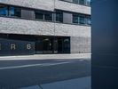 A bird's eye view of a modern office building in Bremen, Germany. The building's facade features a clock and a combination of brick and composite materials. The clear sky and hard shadows create a striking contrast. A symbol of urban design in Europe.