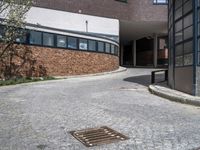 This image captures the charm of Germany's back streets in a classic, urban setting. The architecture showcases a combination of brick walls and grey flooring, with cobblestone roads and asphalt surfaces. The vegetation adds a touch of nature to the bustling city life. The courtyard features a small window and a manhole cover, highlighting the attention to detail in urban design. The public space is lined with warehouses and factories, creating a sense of industrial charm. This photo represents the unique blend of old-world charm and modern urban living in Europe.