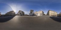 A panoramic view of Berlin's modern architecture and cityscape. The low-rise buildings with concrete facades and metal structures create a mix of classic and brutalist architecture. The sunny day highlights the vibrant urban design of this metropolitan area.
