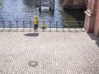 A top-down view of a modern city in Germany. The city's impressive architecture is reflected in the calm waters of a river and lake. Cobblestone streets, elevated walkways, and urban design create a vibrant urban landscape.