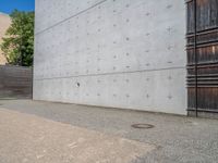 A modern architecture wall in Berlin, Germany, under a clear sky. The concrete surface contrasts with the open gravel area. Urban design in Europe with a touch of minimalism.