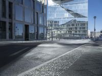 Modern architecture in Berlin's business district. Glass-walled office buildings reflect the city's urban design. Empty streets lined with squares cast hard shadows. A glimpse into European city life.