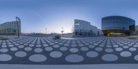 A unique perspective of a modern architecture building in Berlin, Germany. The panoramic view captures the city's urban design and infrastructure. The clear sky reflects on the glass facade, creating a striking visual. A Futurium in the heart of Europe.