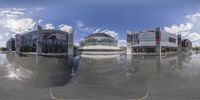 A 360-view of the plaza in Berlin, Germany. The modern architecture of the buildings reflects against the clear sky, creating a stunning visual. The plaza is a vibrant urban space, perfect for both tourists and locals to enjoy.