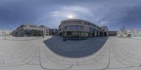 The sleek exterior of a modern office building in Bremen, Germany is reflected in a 3D sphere mirror image. The reflective surface creates a striking contrast against the clear sky. A perfect blend of modern architecture and urban design.