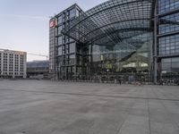 This is an image of a modern architectural building in Berlin, Germany. The building's facade is made of glass and steel, reflecting the clear sky and creating a striking urban design. In the foreground, a plaza with an open space provides a break of day for city life. The road surface and iron features add to the modern aesthetic, while some people can be seen inside the building. This photo represents the dynamic and vibrant business district of Berlin.
