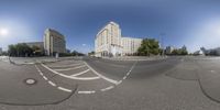 A dynamic cityscape in Berlin, Germany, showcasing modern architecture and urban design. The fisheye lens captures the bustling intersection, lined with buildings and vibrant public spaces. Clear skies enhance the vibrant streetscape.