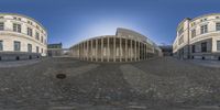 a fisheye view of a wide city with an outside clock at the bottom of the building